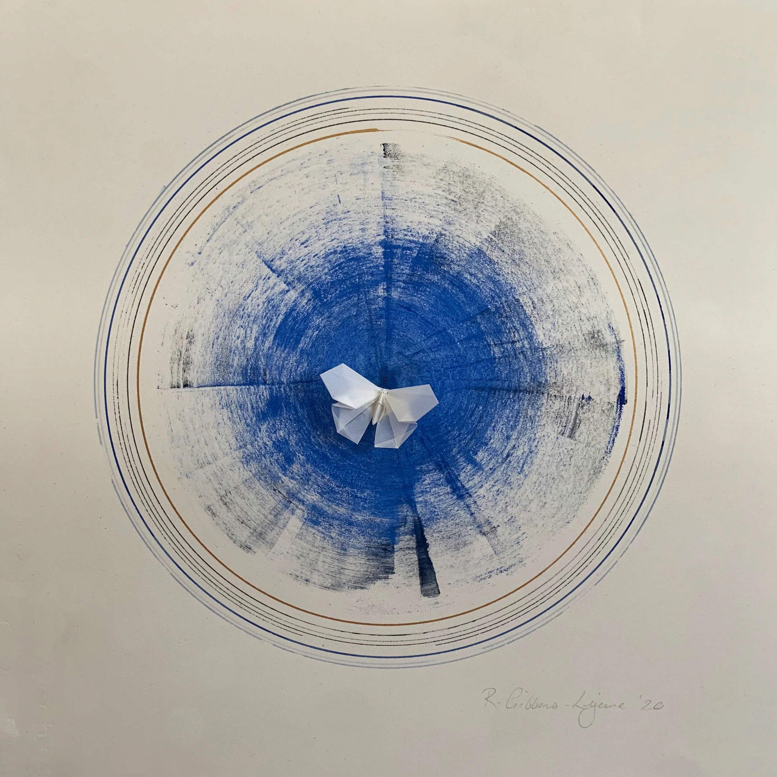 Mixed papers, including traditional Japanese washi, on handmade sunn hemp paper dyed with indigo; liquid gold and white decorative detail.